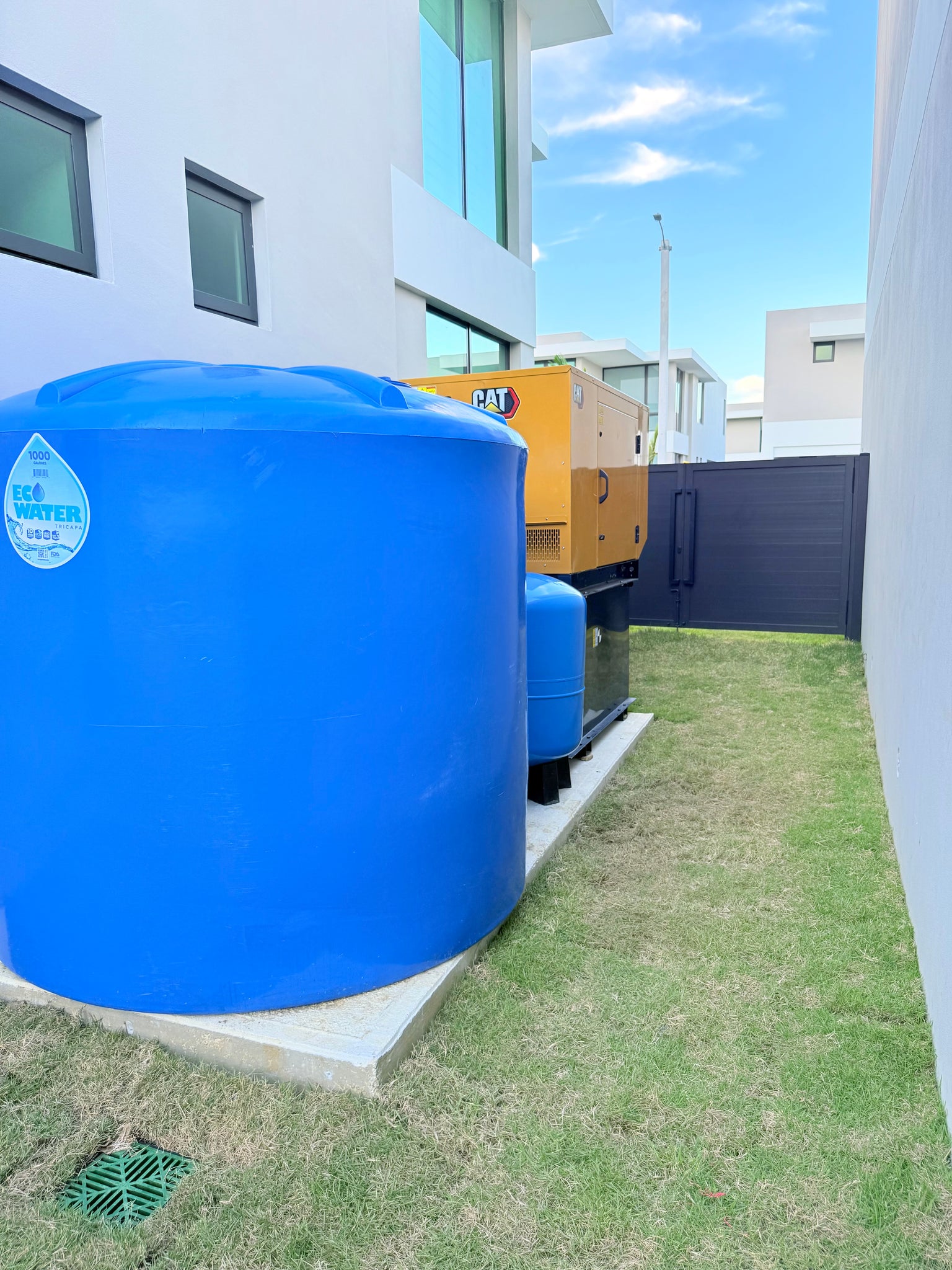 Featuring 3 bedrooms with ensuite bathrooms, a guest half bath (3.5 total), family room, modern kitchen with new appliances, open-concept living and dining areas, washer and dryer, solar water heater, A/C units, luxury lighting, installed curtains, and a double garage with automatic door. Includes a diesel generator, water cistern, and all brand-new, energy-efficient equipment.